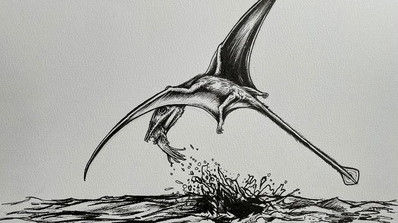 Zeichnung eines Flugsauriers beim Fangen eines Tintenfisches.