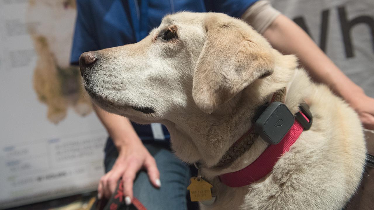 Ein Hund trägt einen GPS-Tracker am Hals.