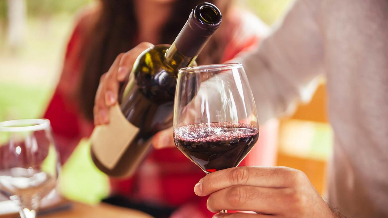 Rotwein wird aus einer Flasche in ein Glas eingeschenkt.