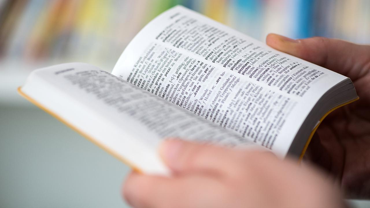 Eine Frau schaut in ein Italienisch-Wörterbuch.