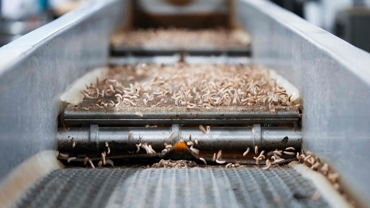 Wenn es den Larven an den Kragen geht, hüpfen sie zunächst über ein ratterndes Band in Richtung eines riesigen Trockners. „Wenn wir die Larven von ihren festen Bestandteilen getrennt haben, bekommen wir das Insektenmehl raus“, erklärt Maden-Züchterin Jane Lind Sam. „Es ist ein Pulver mit etwa 55 Prozent Protein.“