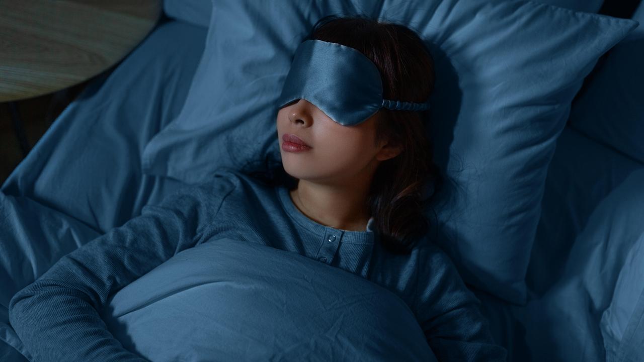 Eine Frau schläft nachts zu Hause im Bett mit Schlafmaske.