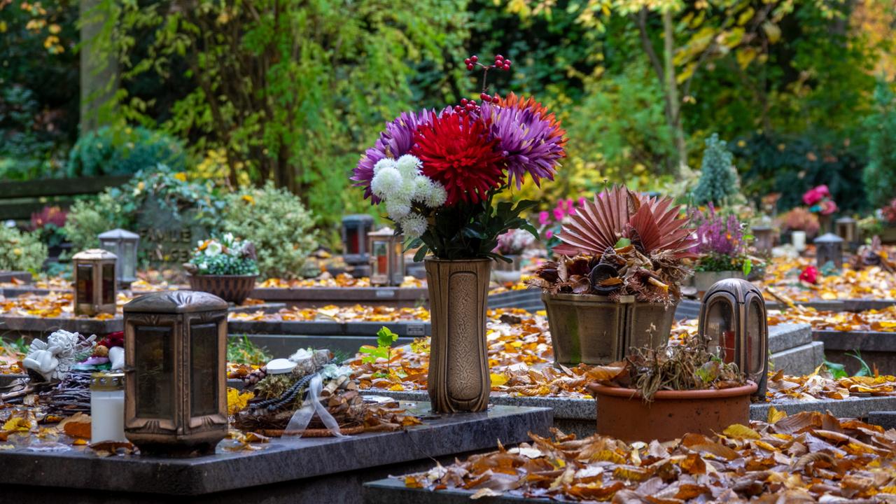 Herbstlaub liegt auf Gräbern auf einem Friedhof.