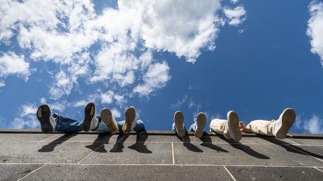 Füße von Jugendlichen, die auf einer Mauer sitzen.