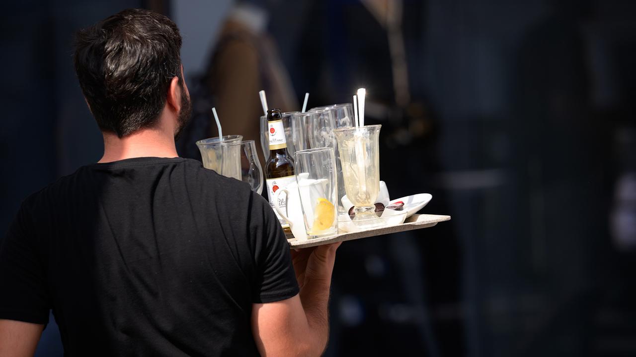 Ein Kellner trägt ein Tablett mit benutzten Gläsern und leeren Flaschen.