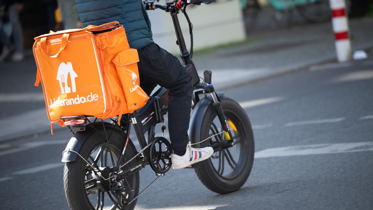 Ein Fahrer für den Essenslieferdienst Lieferando fährt über eine Straße