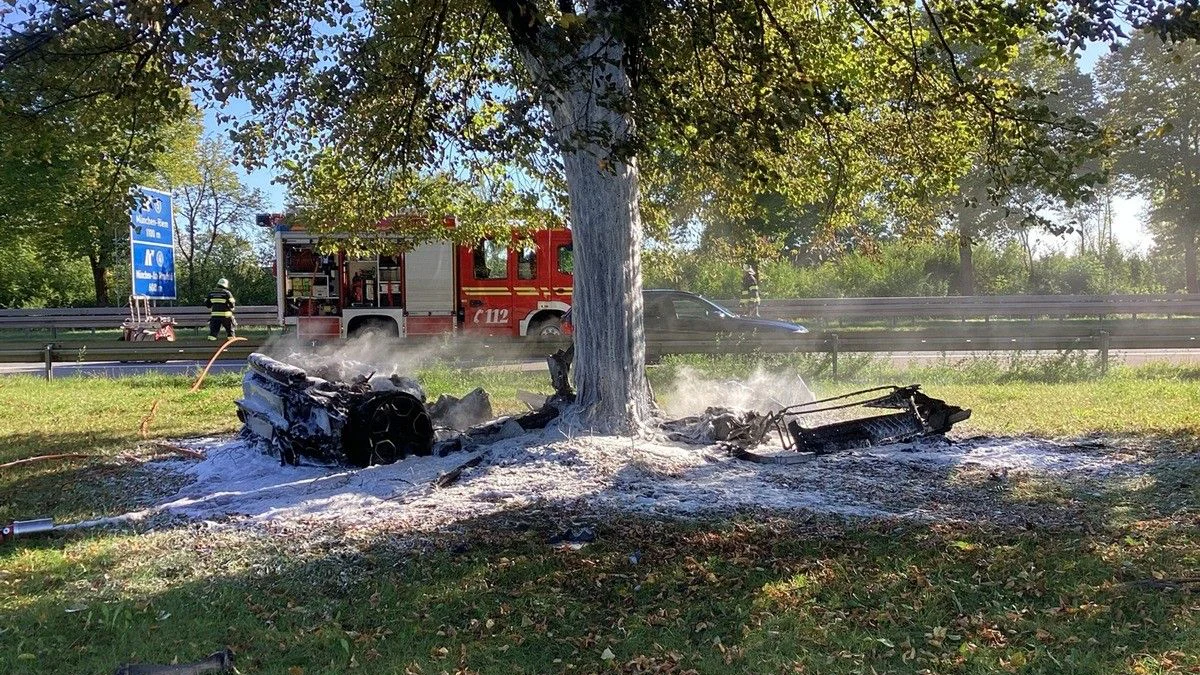 Ein Sportwagen kracht auf der A94 bei München gegen einen Baum, zerreißt in zwei Teile und fängt Feuer. Die Autobahn ist mit Trümmern übersät.
