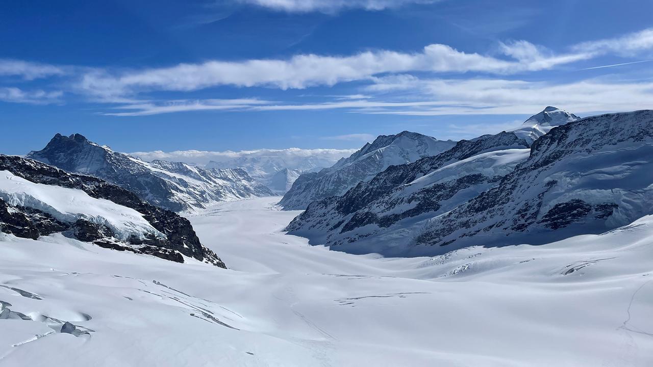 Das Jungfraujoch ist ein Ort, an dem man sich der Ewigkeit sehr nah fühlen kann – und doch die Vergänglichkeit vor Augen hat. Zwischen den Berggipfeln fließt der größte und längste Eisstrom der Alpen: der Aletschgletscher. Schneeweiß und majestätisch präsentiert sich der Eisgigant in der Wintersonne. Doch für die Jahreszeit liege viel zu wenig Schnee, der viel zu schnell wieder schmelze, sagt Furrer. Es sei schrecklich anzusehen, wenn der Gletscher blank liegt.